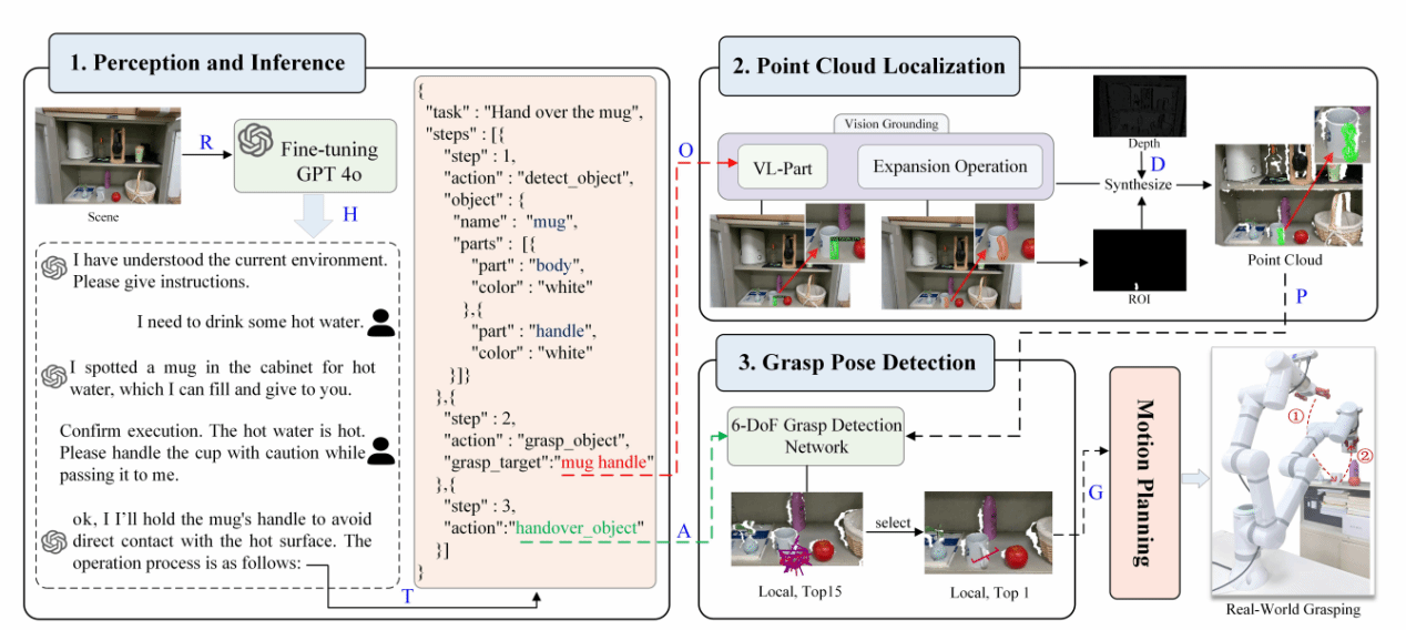 该论文提出了一种新的基于自然语言交互与大语言模型常识推理的机器人抓取框架LangGrasp。该框架集成了微调的大型语言模型(LLMs),以利用其强大的常识理解和环境感知能力,从而从语言指令中推断隐含意图,并澄清任务需求以及目标操作对象。此外,设计的点云定位模块,在二维部件分割的指导下,实现了场景中的部分点云定位,从而将抓取操作从粗粒度的对象级扩展到细粒度的零件级操作,显著提高了目标物体六自由度抓取姿态的质量和精度。