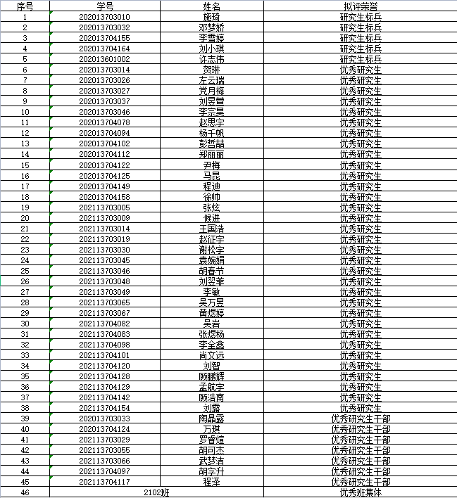 组织开展了2021-2022学年度 “研究生先进班集体”和“优秀研究生标兵”、“优秀研究生”、“优秀研究生干部”评比,现将评选结果予以公示,公示期三天(11月9日-11月11日),对评选结果有任何异议可到研究生管理办公室(30216)进行反映,反馈电话:0276889336。