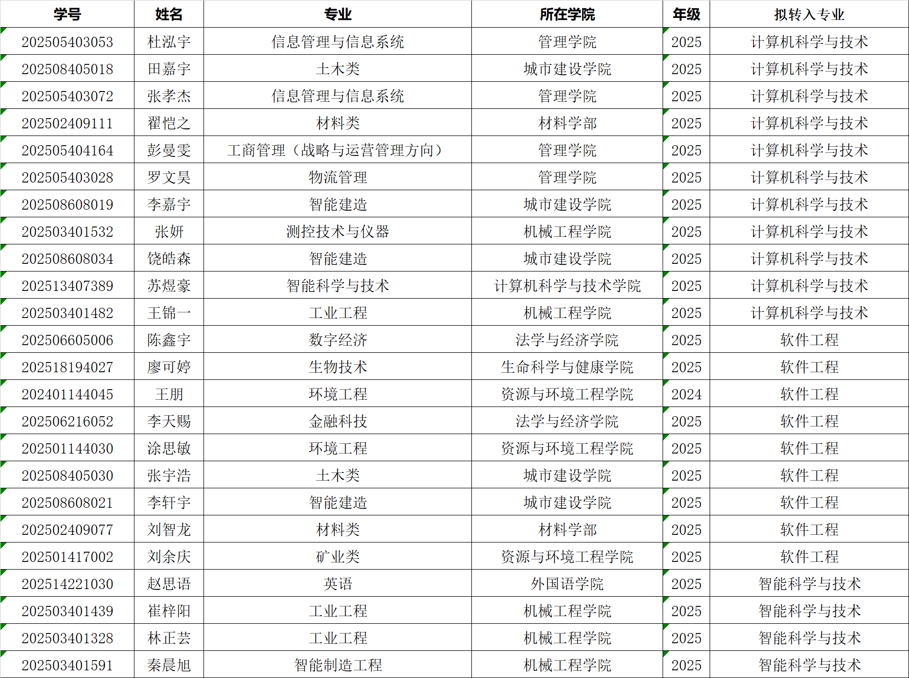 于2025年12月26日组织了转专业PAT考试,2025年12月29日组织了转专业综合面试,对学生的专业基础知识、基本能力和专业思想情况等进行了考核。学院综合PAT考试成绩和综合面试情况,择优拟录取24人,现将拟录取名单公示如下。