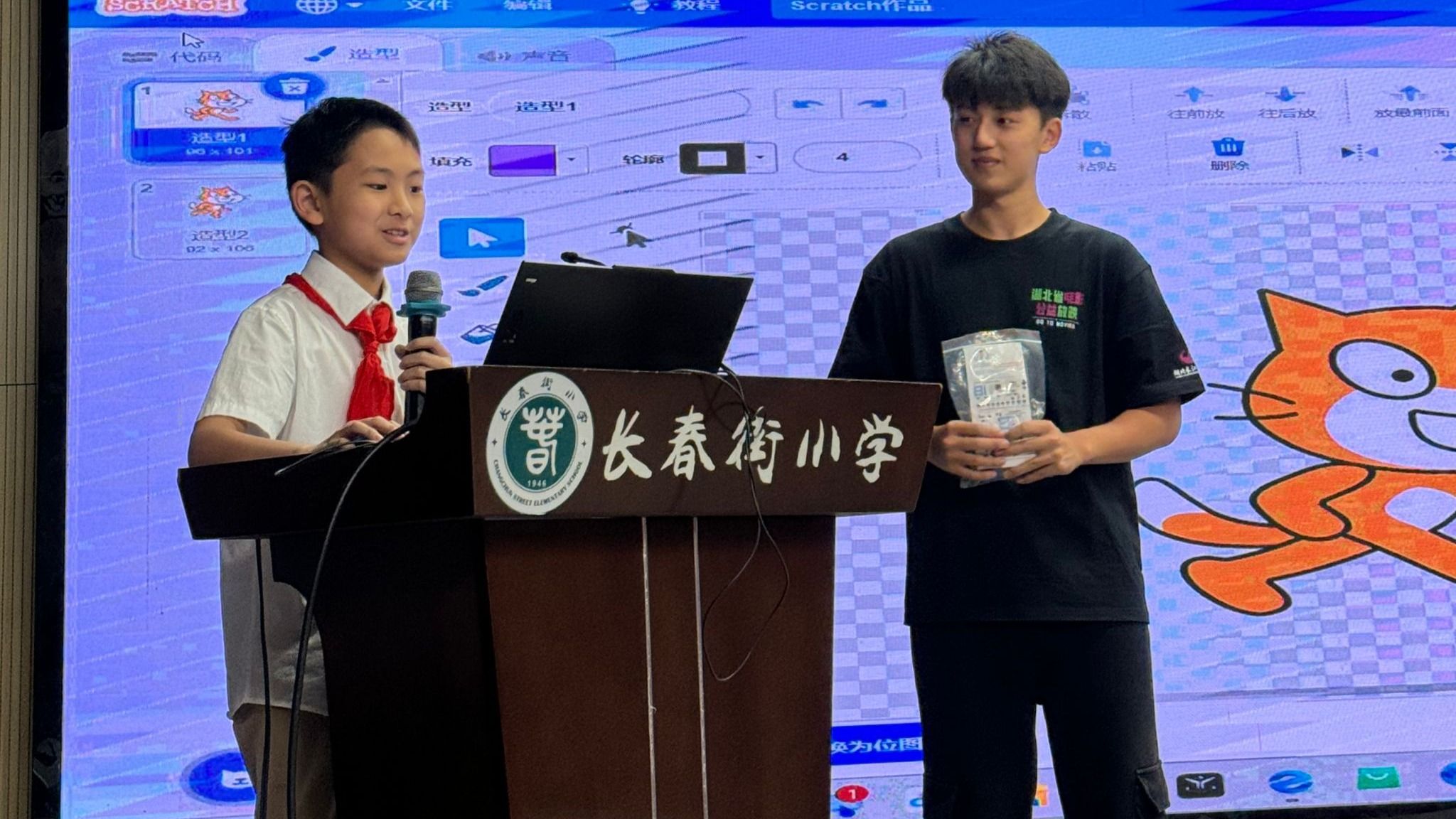 大学生科普宣讲志愿者孙昊羽首先为同学们介绍了电影《流浪地球2》中的太空天梯和月面机器人“笨笨”狗,讲解了其中的物理现象和人工智能技术,然后以坐飞机、过山车和宇航员的太空生活为例,为同学们解释了超重和失重现象及其应用,以AI绘画、AI配音和老照片修复为例,为同学们介绍了人工智能在生活和电影中的应用。孙昊羽还结合自己所学的计算机专业知识,引导和鼓励同学们学习少儿编程,培养计算思维和创新能力。在编程体验环节,一位“小小程序员”上台很快就敲出了目标程序并为同学们现场讲解,展现出良好的编程逻辑思维与动手能力。