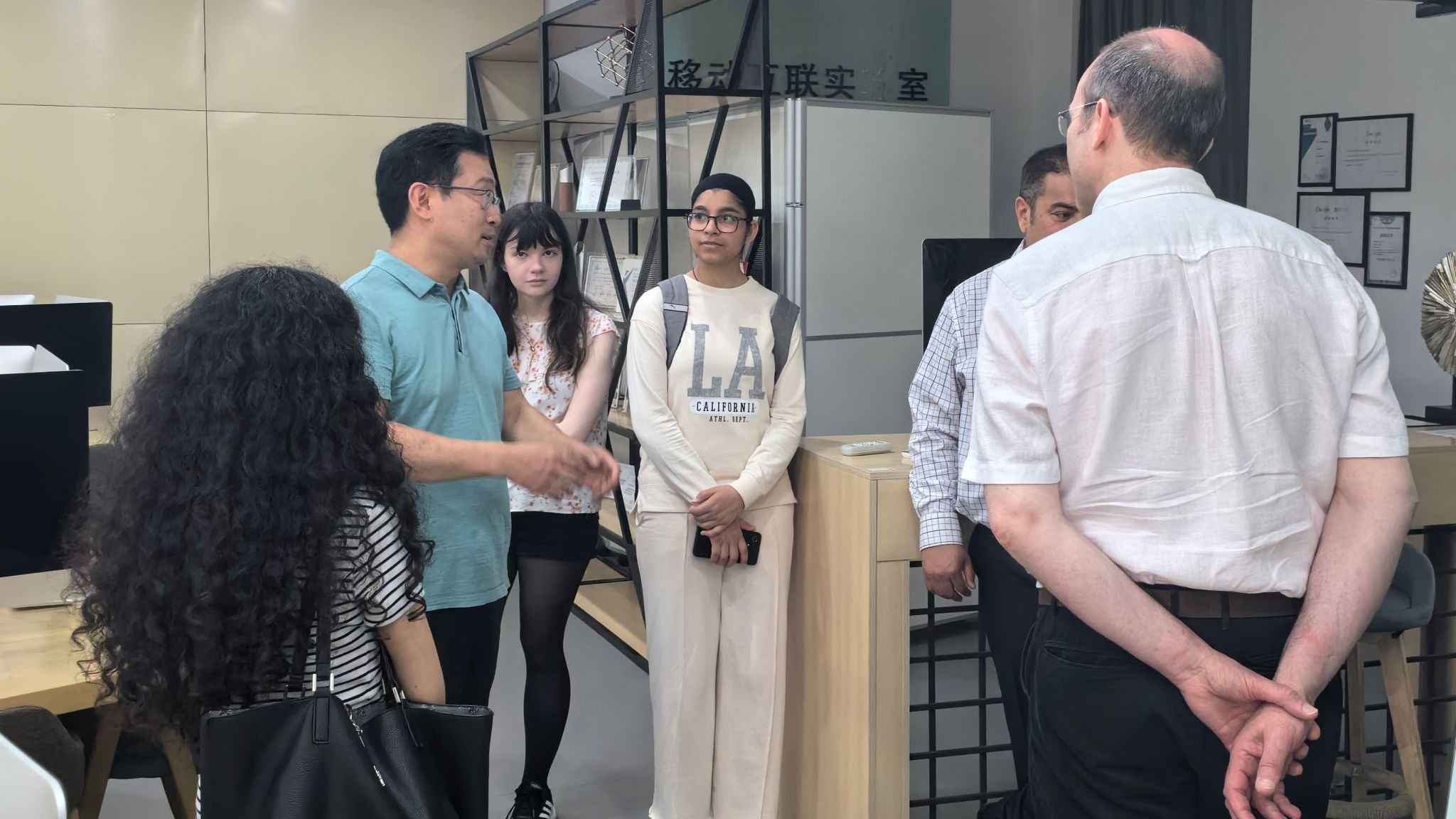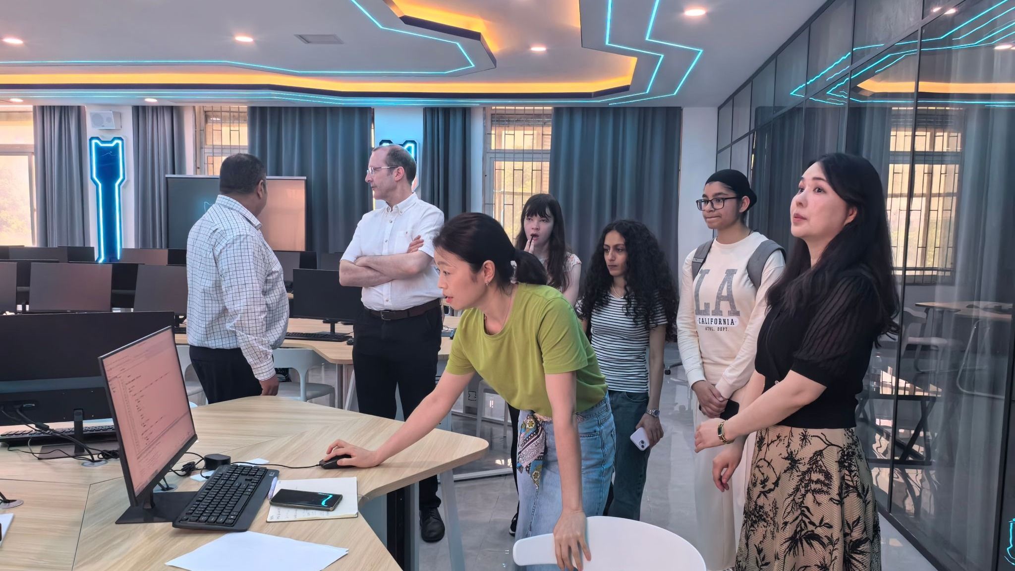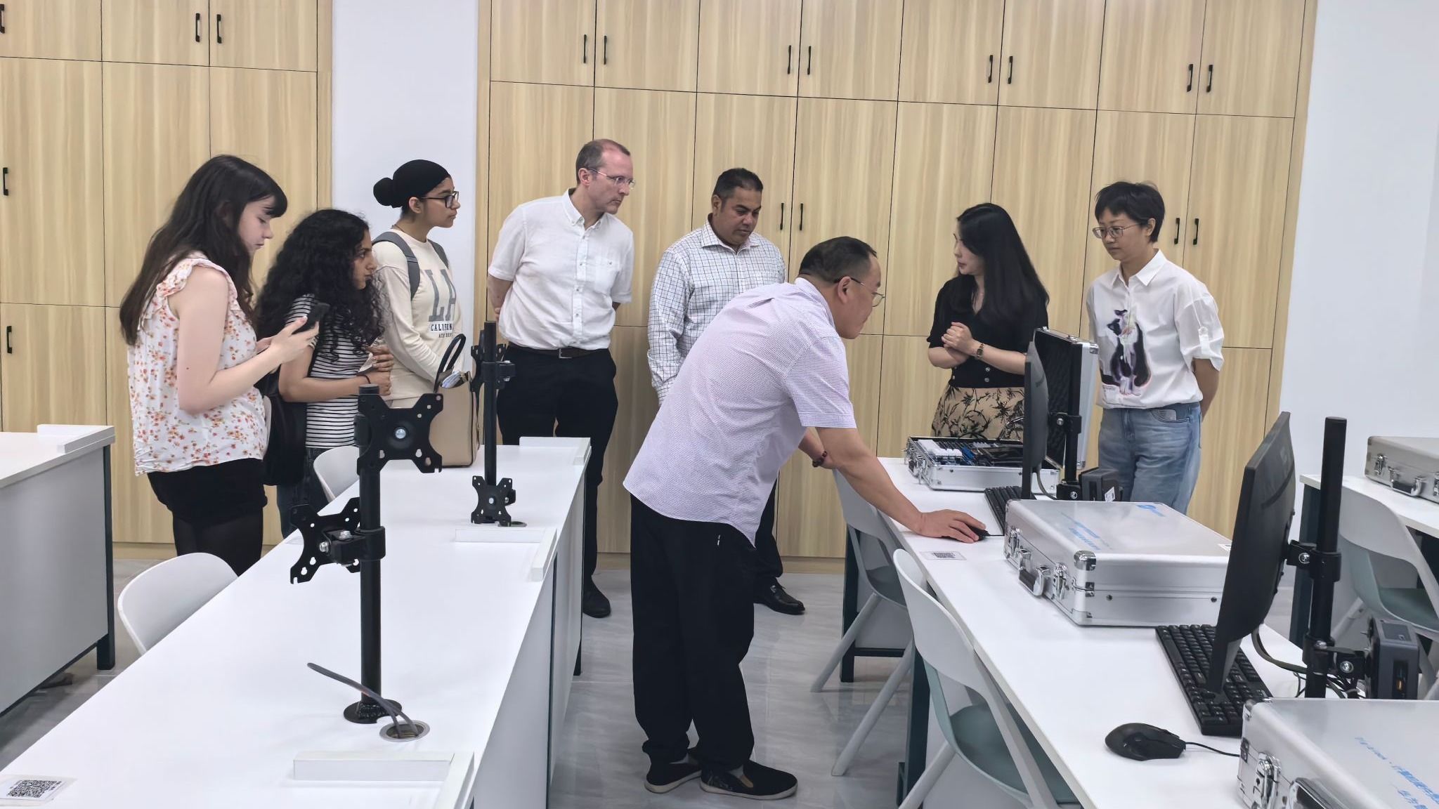 实验室主任刘星老师的陪同下,英国伯明翰城市大学的师生深入各实验室进行了实地参观;在30101实验室,王晓峰老师详细介绍了虚拟仿真中心的发展历程和独特的实验教学资源;在30501实验室,陈姚节老师向客人展示了基于华为技术的硬件实验箱的实际应用;在30303实验室,谢潇老师带领客人领略了全国产华为生态的软件工程实验室的魅力;最后在30204实验室,胡威老师分享了移动互联实验室的特色项目和学生竞赛的丰硕成果。