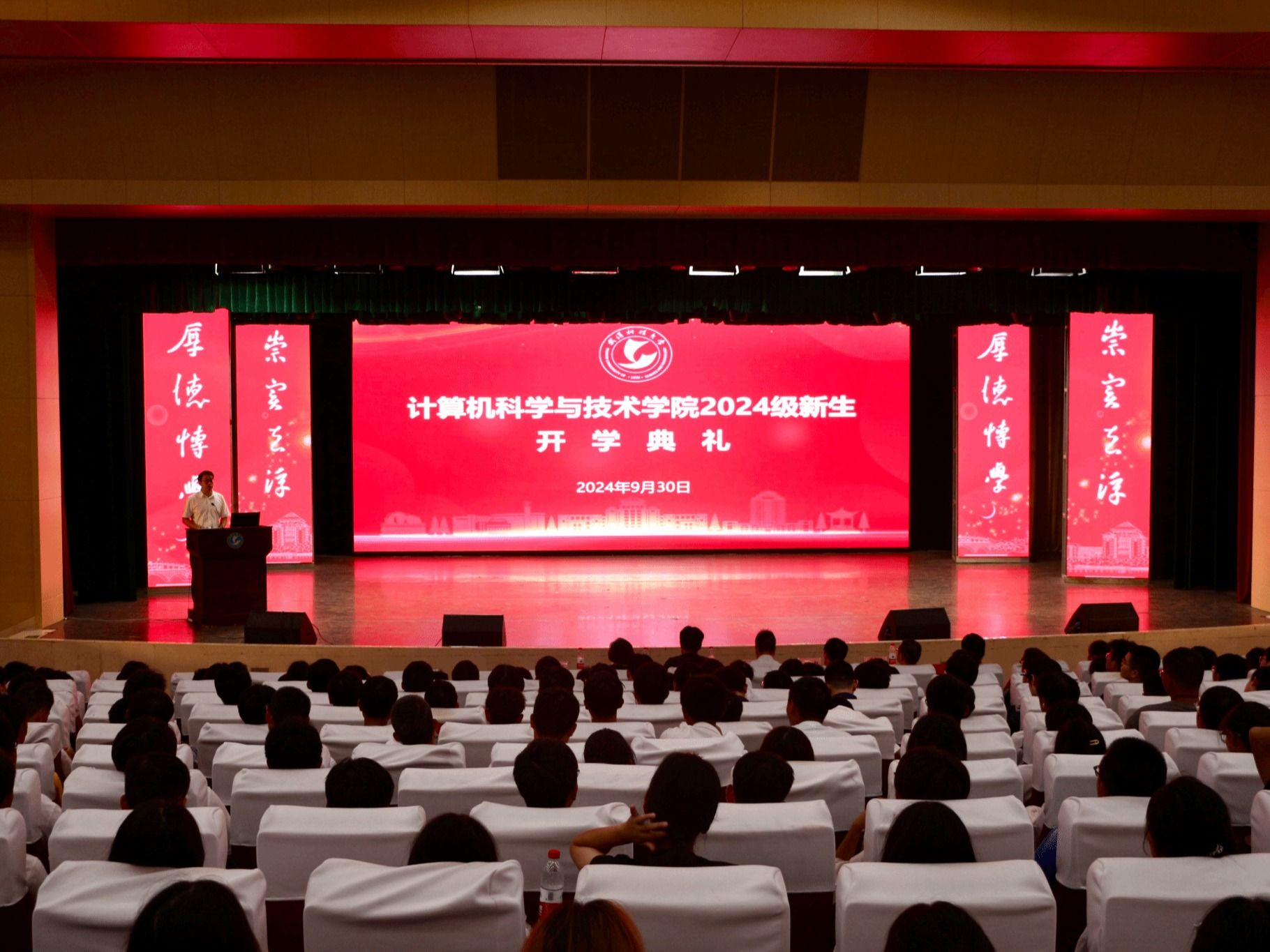 党委书记余淑均、党委副书记蔡路、副院长徐新、王玲,各系(室)主任、各年级辅导员、2024级本科班主任和583名本科新生、173名硕士生和8名博士生新生一同参加开学典礼。