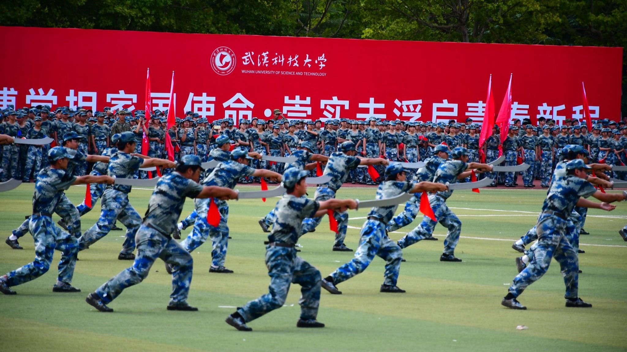 参训学生组成的特色方阵——大刀队与棍术队展现了扎实的训练成果。大刀队动作刚猛、气势如虹,棍术队招式流畅、虎虎生风。队员们动作齐整有力,招式利落干脆,以稳扎稳打的表现与昂扬的斗志,赢得全场师生热烈掌声,尽显计算机学子过硬的军事素养与默契的团队协作精神。