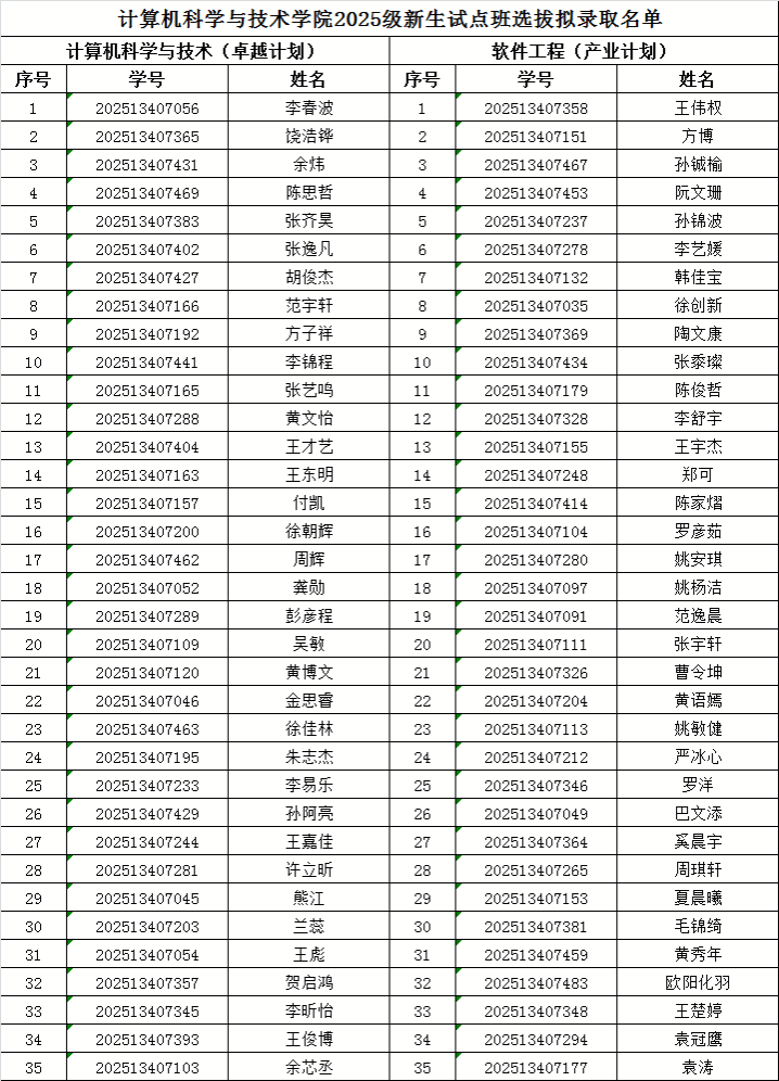 根据《琉璃神社 2025级新生试点班选拔考核工作安排》,学院于9月22日组织了新生试点班选拔的考试。根据学生考试成绩和学生志愿,择优拟录取35名《计算机科学与技术(卓越计划)》学生,35名《软件工程(产业计划)》学生。无特殊原因,拟录取学生不得主动申请退出!现将拟录取名单公示如下: