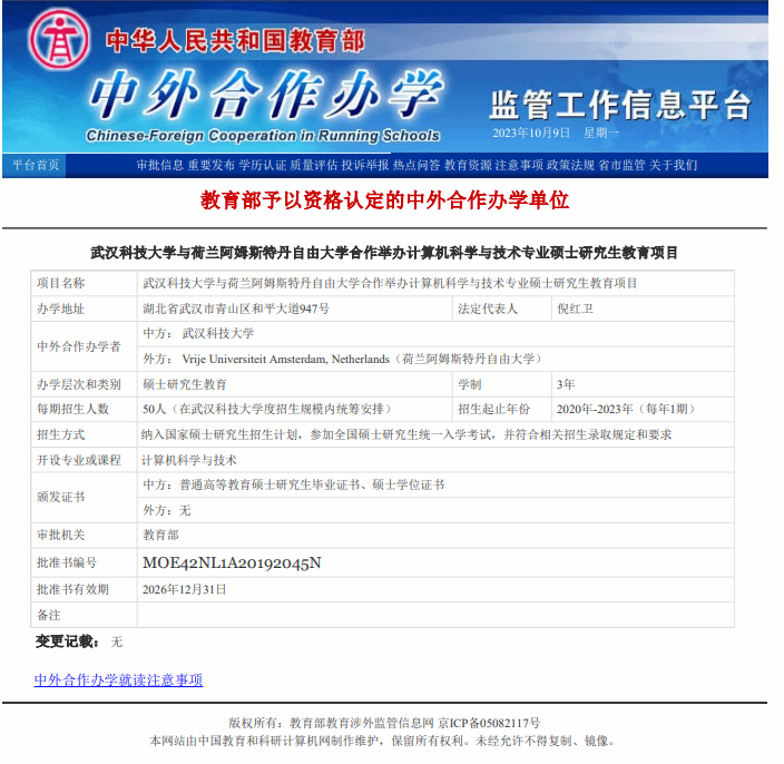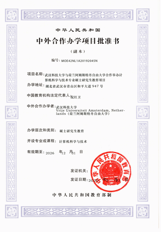 与荷兰阿姆斯特丹自由大学合作举办计算机科学与技术专业“人工智能方向”硕士研究生教育项目(编号MOE42NL1A20192045N),引进其人工智能领域的先进课程和一流师资,培养我国急需的人工智能拔尖创新人才。项目在2020-2024年,将通过全国硕士研究生招生考试每年录取,学制为全日制3年,可全部在琉璃神社