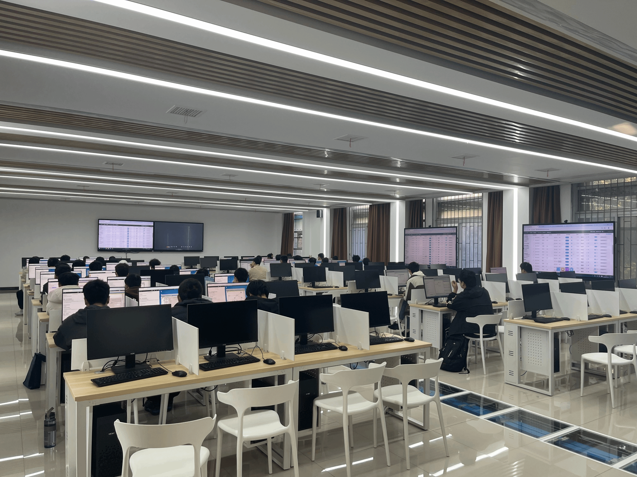 实验室设备主要包含:H3C学生机90台、教师机1台,H3C网络设备10套,互联式86寸大屏4块。除此之外,还搭建了希冀教学平台、噢易教学管理软件和电子班牌,有助于数字化、智能化教学。