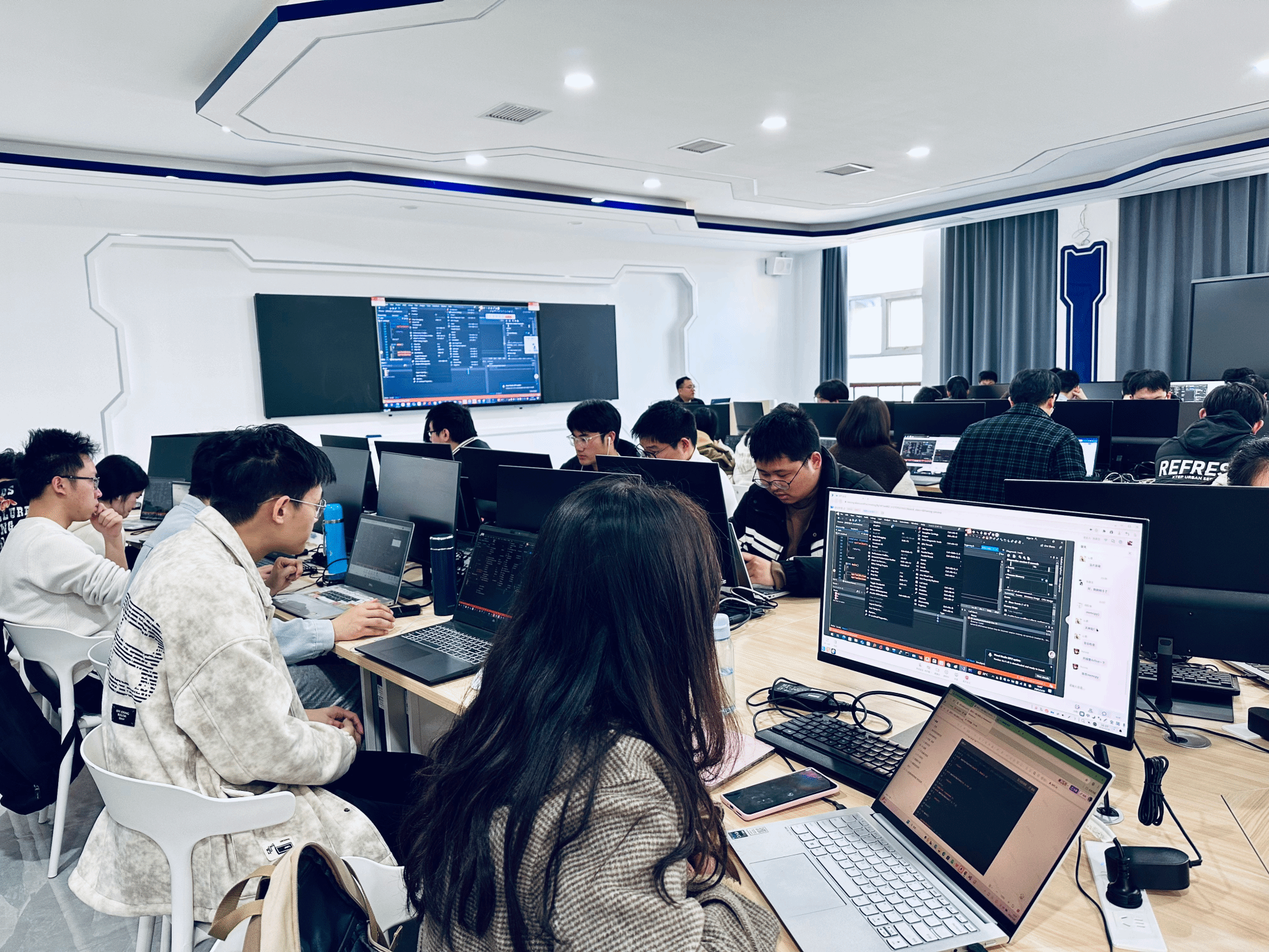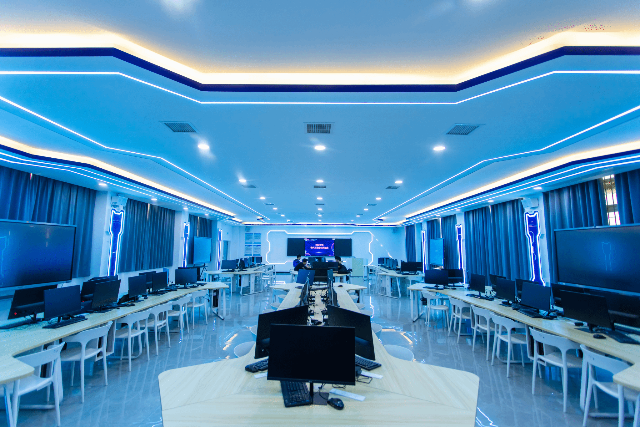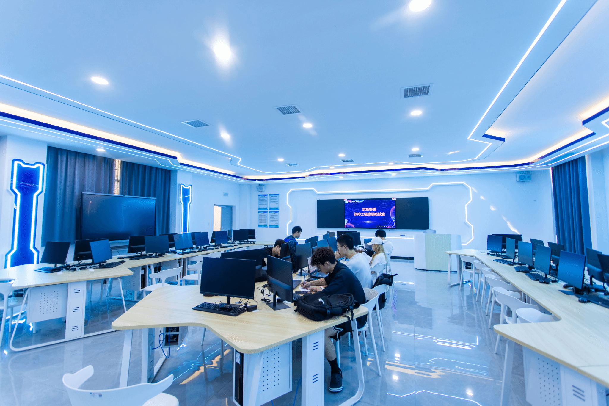 实验室介绍:本实验室占地约280平方米,共有85台教学终端、8台服务器、4有台交换机、4台智慧显示屏等,实验室设备全部国产化。其中教学终端操作系统为UOS(统信)教育版V20、CPU为飞腾D2000,服务器操作系统为UOS统信服务器操作系统V20。本实验室以华为鲲鹏920CPU国产服务器(7台计算节点、1台管理节点)为基础,搭配了一套华为生态下的虚拟化管理平台,构建了一个能够完成华为鲲鹏计算、欧拉操作系统、openGauss 数据库三门国产课程置换的实验平台。此平台把服务器资源虚拟为85个搭载鲲鹏CPU、欧拉服务器操作系统以及opengauss数据库的虚拟机,能同时满足85名学生通过web界面开展华为国产化相关实验。实验室管理系统可支持机房预约、智能控制等功能。